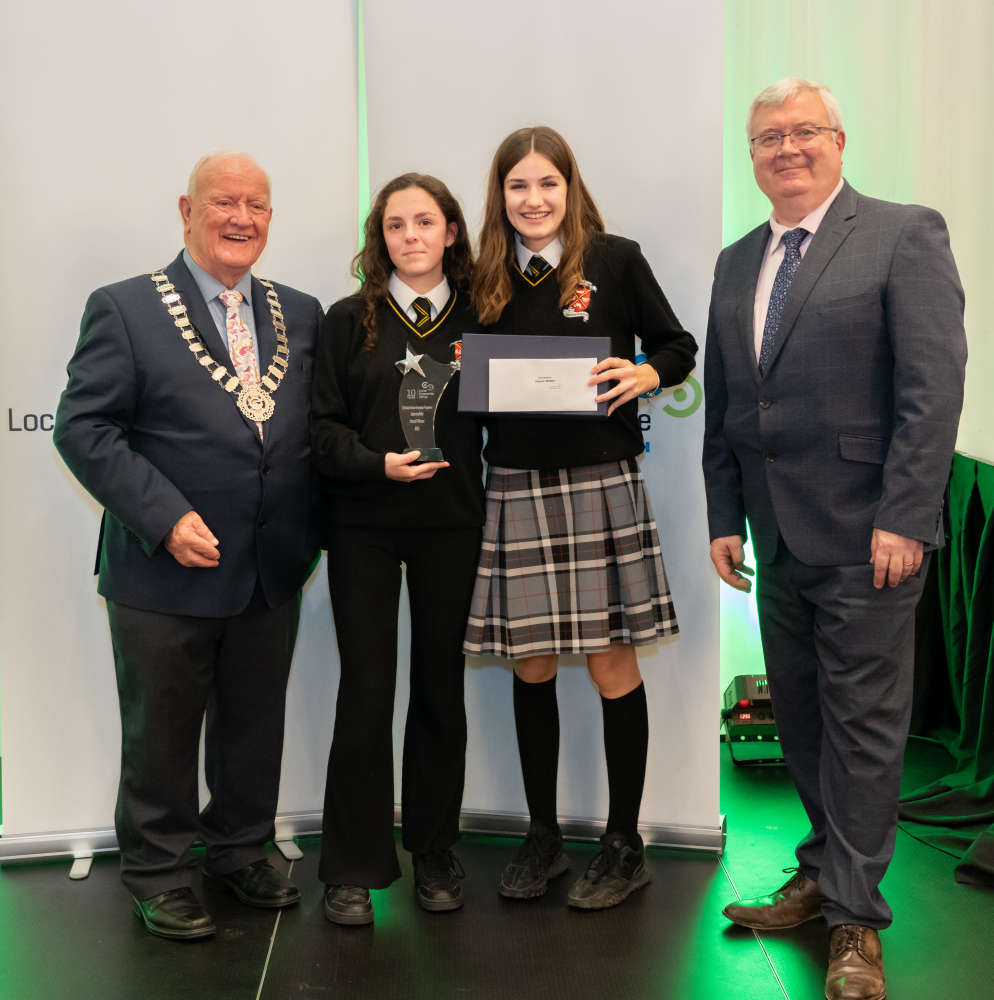 L-R: Meath County Council Cathaoirleach Cllr. Tommy Reilly, Annable Kavanagh, Bláithín Doonan from M.E.N.D., Coláiste Ríoga Dunshaughlin, and Meath County Council Chief Executive Kieran Kehoe.