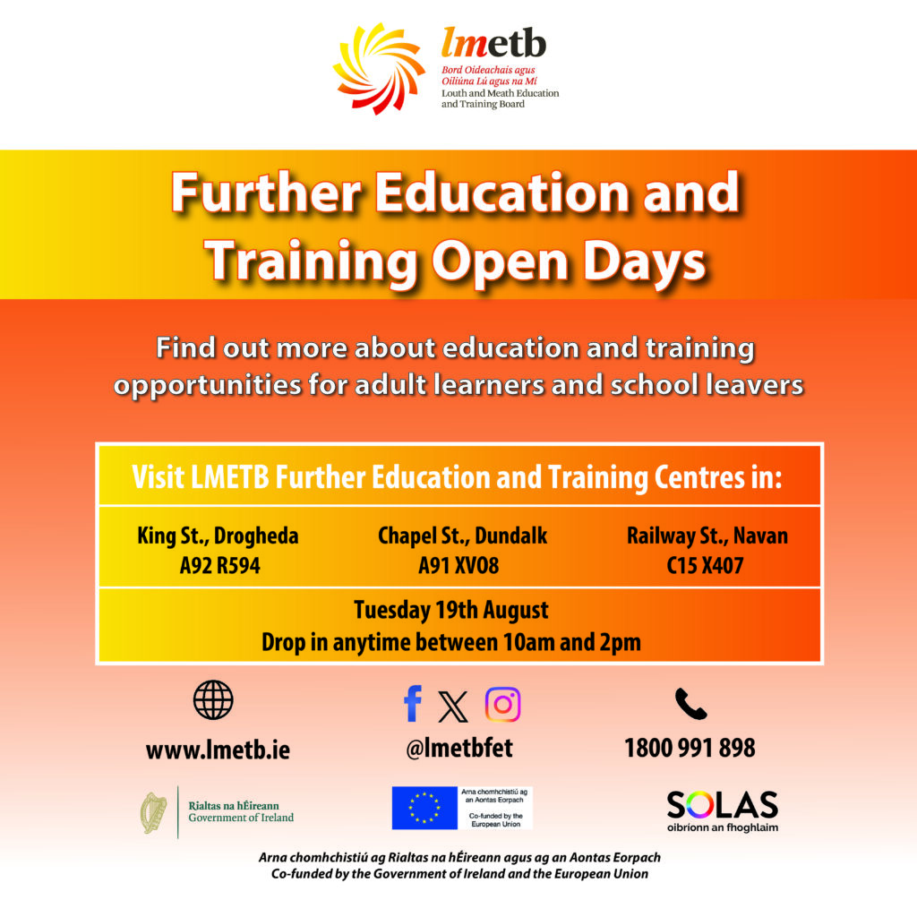LMETB’s Further Education and Training (FET) Service will host Open Days in Dundalk, Drogheda and Navan in August which are open to all. ...